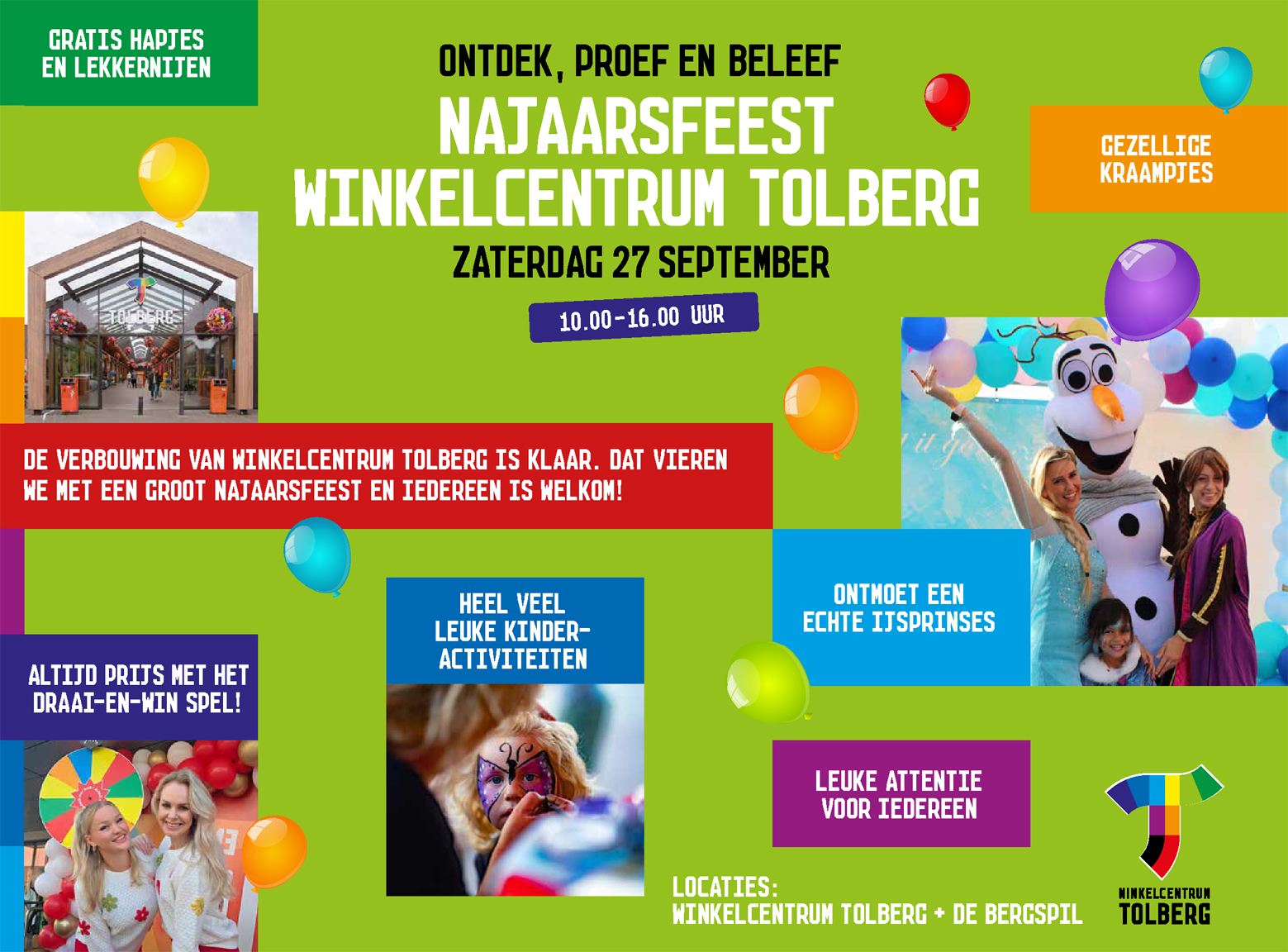 De verbouwing van winkelcentrum Tolberg in Roosendaal is afgerond en dat vieren we groots! Op zaterdag 27 september van 10.00 tot 16.00 uur organiseren de ondernemers in samenwerking met De Bergspil een fantastisch najaarsfeest voor jong en oud. Iedereen is van harte welkom!
