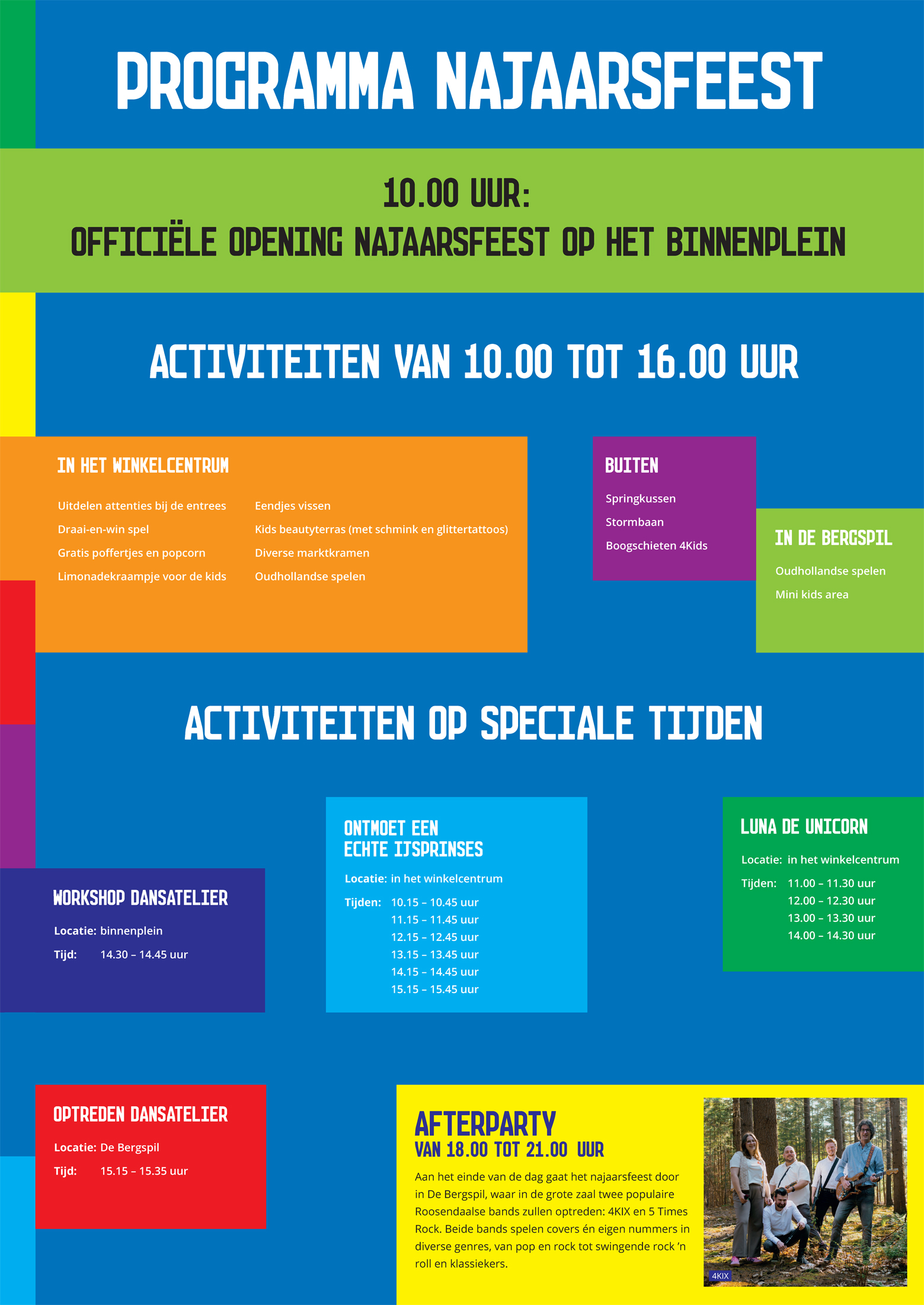 Na de festiviteiten in en rond het winkelcentrum gaat het najaarsfeest door in De Bergspil, waar vanaf 18.00 uur in de grote zaal twee populaire Roosendaalse bands optreden: 4KIX en 5 Times Rock. Beide bands spelen zowel covers als eigen nummers in diverse genres, variërend van pop en rock tot swingende rock ’n roll en klassiekers die je uit volle borst kunt meezingen. Let’s party!